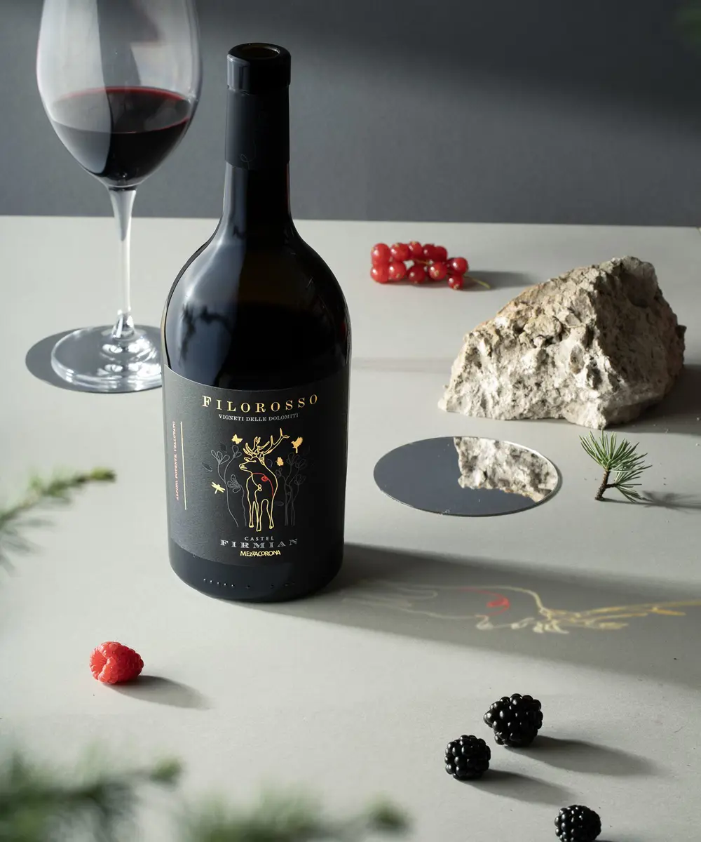 Le uve selezionate di Merlot e Cabernet Sauvignon crescono nelle vicinanze del lago di Garda, mentre le uve di Teroldego sono raccolte in vigneti vicini alle rocce dolomitiche, dove sono esposte alla luce diretta del sole, ma anche a quella riflessa delle rocce bianche. Ciò produce una parziale disidratazione delle uve e una leggera sur-maturazione. Questo processo naturale favorisce la maturazione polifenolica delle uve e l'accumulo di aromi e struttura. Le uve vengono raccolte manualmente tardi in settembre e, dopo la pigiatura e la diraspatura, vinificate in acciaio per circa 14 giorni a una temperatura di 26-27°C con l'aggiunta di lieviti selezionati. Successivamente, una parte del vino matura in barrique di secondo uso per diversi mesi e il restante 10% in barrique nuove.