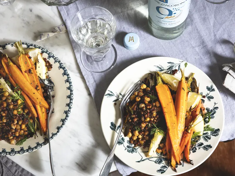 Carote arrosto con ceci e lenticchie al limone