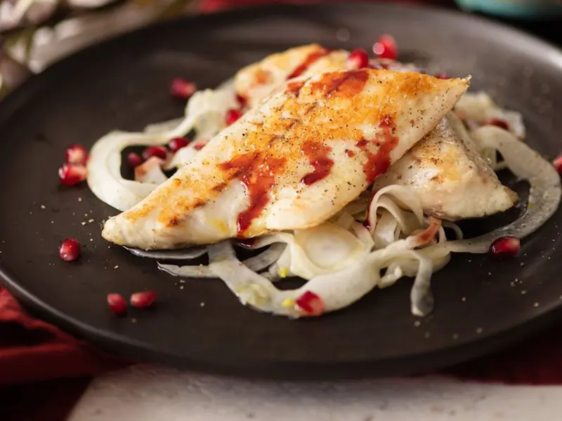 Filetto di branzino su letto di julienne di finocchi marinati e melograno