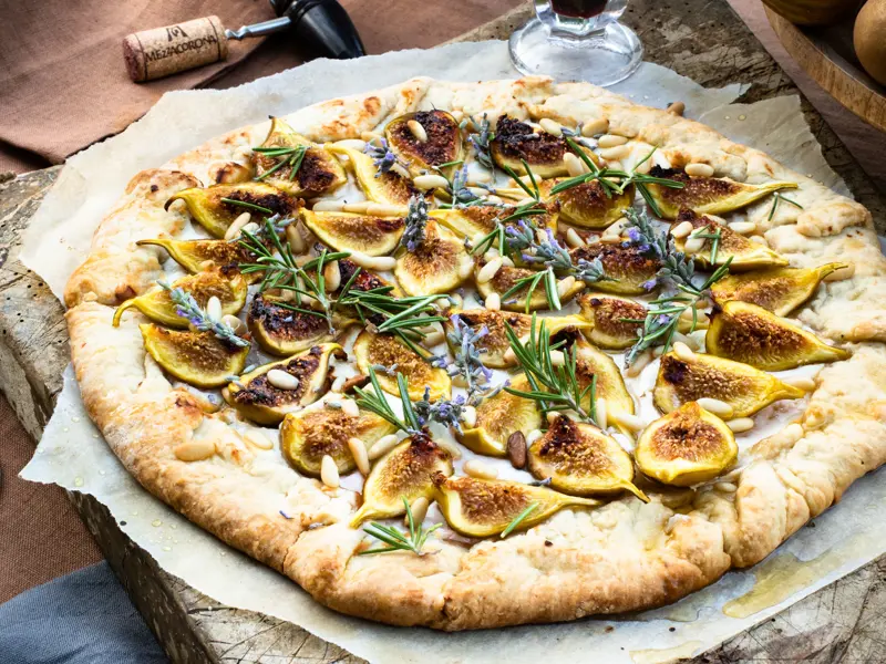 Per la preparazione impastate la farina, lo zucchero e il burro fino ad ottenere un composto grossolano. Aggiungete l’acqua e continuate a impastare fino a che l’impasto si rassoda. Avvolgetelo poi nella pellicola e lasciatelo riposare per un’ora circa in frigorifero. Nel frattempo, preparate la frutta lavando e asciugando i fichi e tagliateli poi a spicchi. Stendete l’impasto su un piano di lavoro leggermente infarinato e lavoratelo con il mattarello ottenendo un disco alto circa 4/5 millimetri, adagiatelo quindi sulla teglia rivestita di carta forno. Spalmate il formaggio di capra sulla galette lasciando un bordo di circa 3/4 centimetri. Sistemate fichi e pinoli e ripiegate la pasta verso il centro in modo da creare il bordo della galette. Infornate a 200°C per circa 30 minuti. Una volta sfornata e fatta raffreddare, guarnite con del miele, rosmarino e fiori di lavanda.Accompagnatela con un bicchiere di Teroldego Rotaliano e… un bel mazzo di fiori!