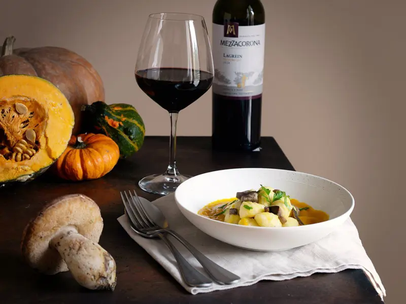 Agli gnocchi di patate su crema alla zucca e formaggio con porcini vi consigliamo di abbinare il nostro Lagrein di Mezzacorona, un vino rosso rubino con note di frutti di bosco, perfetto per questo genere di pietanze.