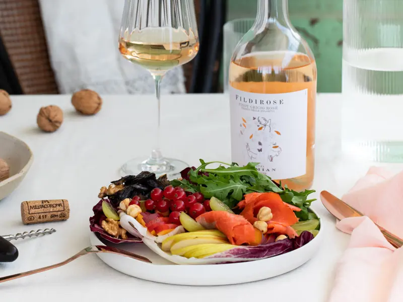 Insalata Fildirose: fresca e saporita, ci ricorda gli stessi colori e sapori dell'estate che ritroviamo nel nostro Fildirose, Pinot Grigio Rosé!
