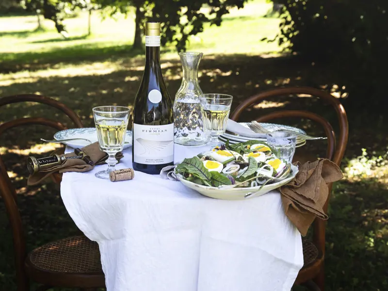 Iniziate lessando le patate e i fagiolini fino a che non risultino morbidi. Cuocete le uova per 6 minuti in modo da ottenere un tuorlo morbido. Tagliate a rondelle le patate e disponetele su un piatto con fagiolini, sgombro sgocciolato, olive taggiasche, cipolla rossa a rondelle e insalata cruda a scelta. Condite con un’emulsione di olio, aceto e filetti d’acciuga. E infine, aggiungete le uova tagliate a metà, il basilico e l’origano.Vi consigliamo di lasciarla riposare in frigorifero per circa mezz’ora prima di consumarla, così da farla insaporire. Godetevi questo piatto estivo all’aperto accompagnato dell’elegante freschezza del nostro Castel Firmian Pinot Grigio Riserva.