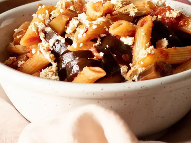 Nel frattempo cuocete le penne, scolatele, e fatele saltare velocemente in padella con il sugo di pomodoro. Aggiungete all’ultimo le melanzane, mescolate e impiattate. Servite con un’abbondante grattugiata di ricotta salata e una fogliolina di basilico.