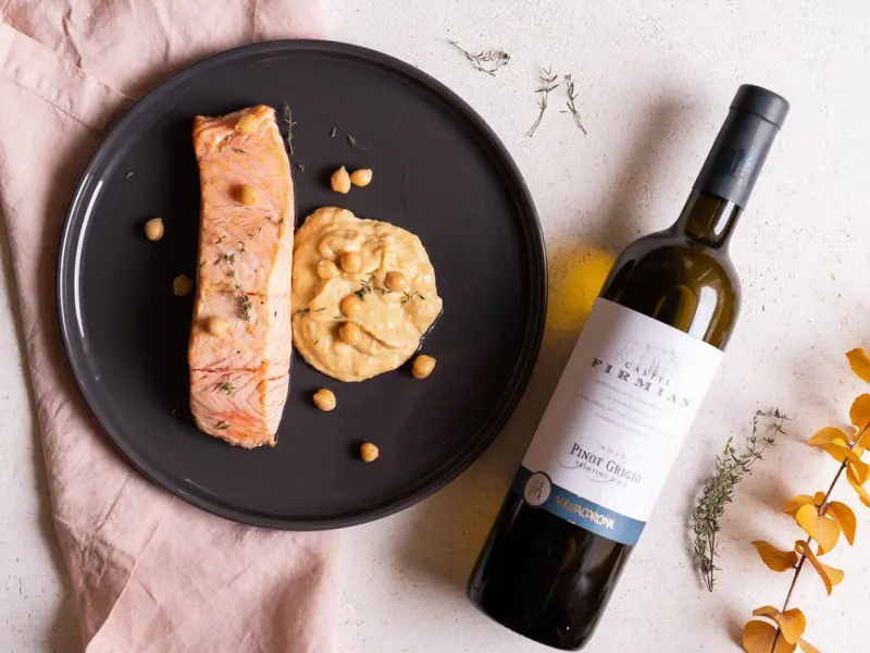 Dopo aver pulito i filetti di salmone, adagiateli dalla parte della pelle in una padella dove avrete fatto rosolare uno spicchio d’aglio con dell’olio. Girateli poi sull’altro lato per 3-4 minuti e conditeli con sale e pepe. Togliete la pelle dai tranci di tonno e trasferiteli nei piatti sopra ad un paio di cucchiai di crema di ceci.