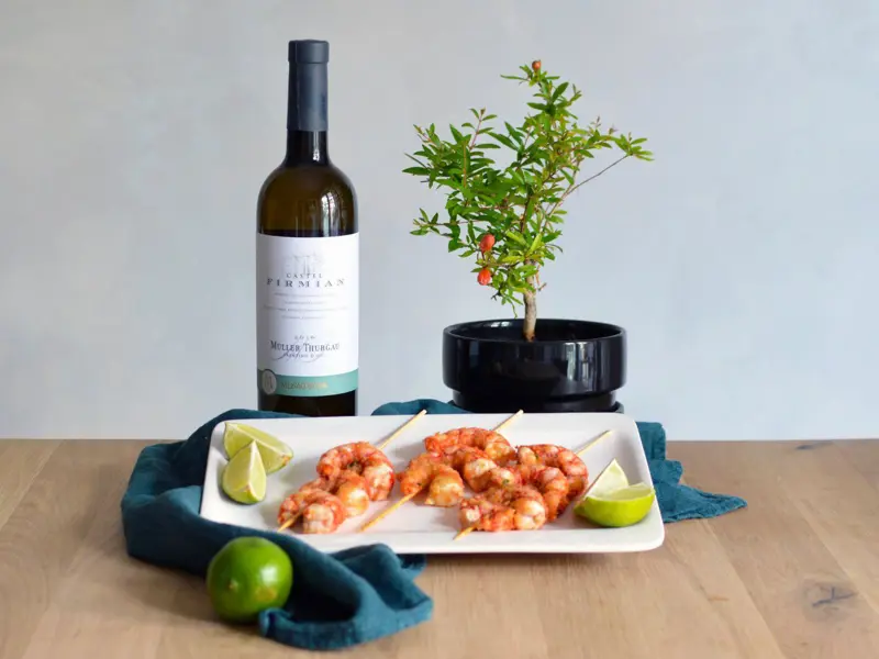 Servire gli spiedini caldi con un bicchiere di fresco Müller Thurgau Castel Firmian di Mezzacorona.