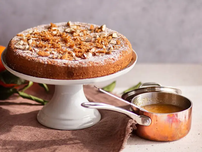 Torta di albumi agli agrumi e mandorle con salsa all'arancia