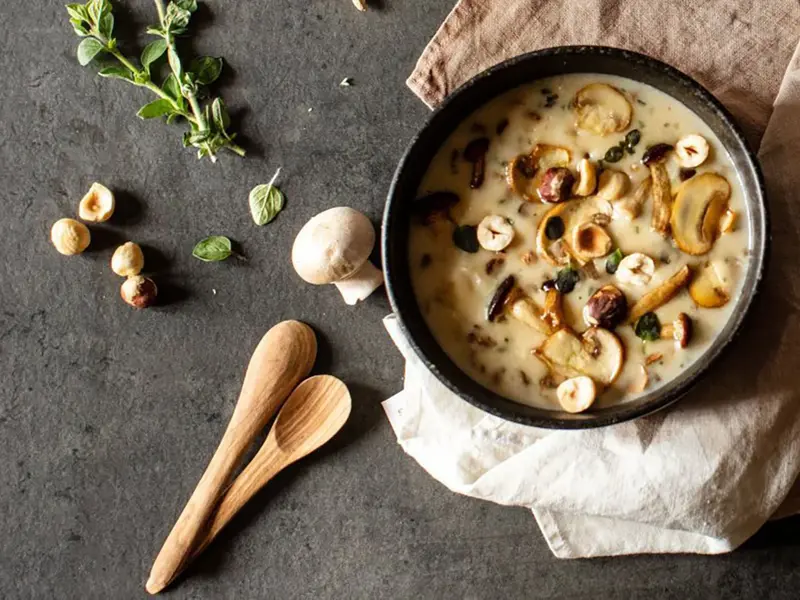 Trascorso il tempo necessario, frullate con un mixer a immersione fino ad ottenere una crema vellutata, aggiustandone eventualmente la consistenza con dell’altro brodo. Regolate di sale e versate nei piatti da portata. Completate il piatto aggiungendo i funghi saltati, le nocciole rimaste e un filo d’olio.